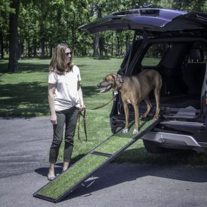 As dog’s age, getting in and out of the car can become difficult, painful, and hard on your dogs’ body. Keep them going and provide the help they need with Gen7Pets® Natural-Step® Ramp for Vehicles. The Natural-Step Ramp features a poly-grass surface that provides a much-needed grip for your dog to get up and down the ramp easily. Designed with your pet’s safety in mind, the Natural-Step Ramp has durable rubber grippers on both ends of the ramp that keeps it secure and in place while in use. The regular-sized ramp features a safety tether latch that attaches to your cargo area’s anchor to provide extra security while the ramp is in use. The Mini-sized ramp does not feature a safety tether. When done, fold the ramp in half and the automatic locking clip keeps it from opening accidentally. A convenient rubber-grip handle and the lightweight design make it easy to store in your cargo area or under the back seat of your car.