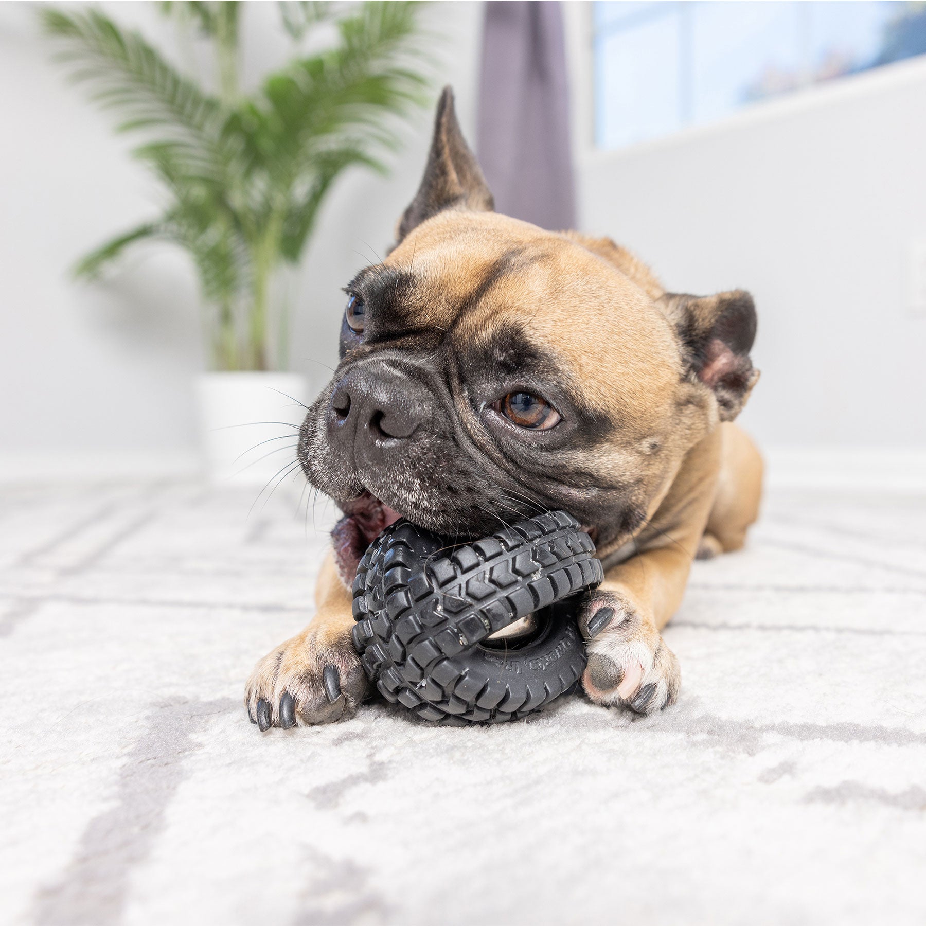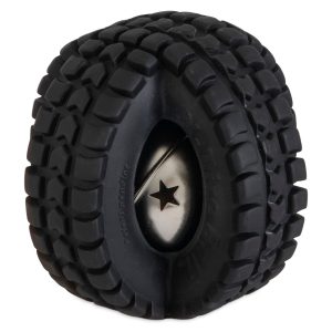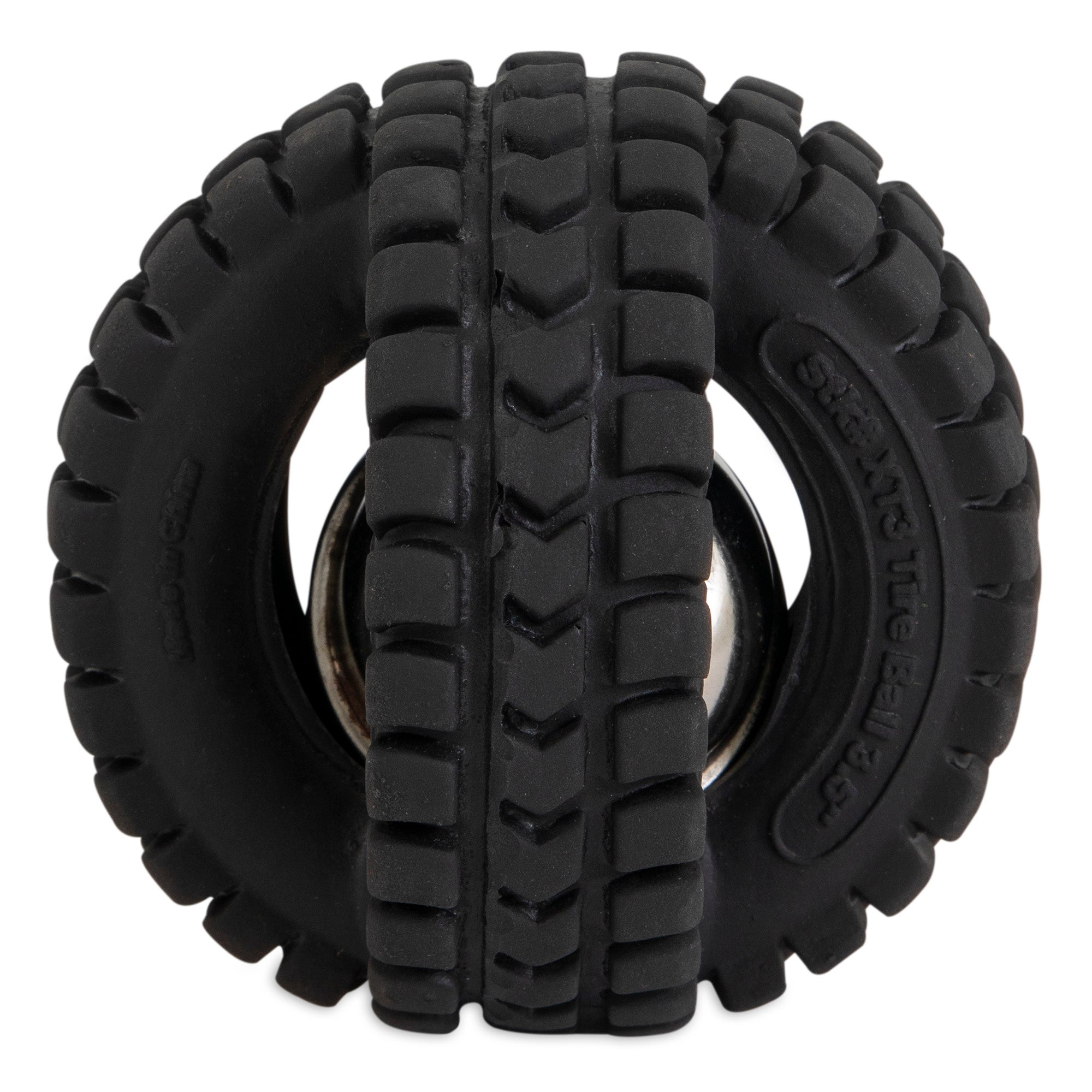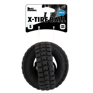 A ball is just a ball, right? Nope, not anymore with Pet Qwerks® Jingle X-Tire Balls! Available in two sizes, X-Tire Balls are made with a pair of small tires ruggedly molded together into a single ball with a hollow center that holds a whopper-sized chrome bell that jingles as your dog shakes, tosses, rolls, retrieves, and flings the ball. The unique design and shape of this dog toy make it super easy for your pet to pick up and have fun rolling action. Get your dog their new favorite ball with a Pet Qwerks Jingle X-Tire Ball.