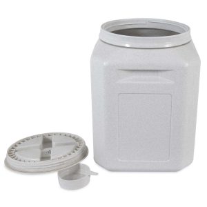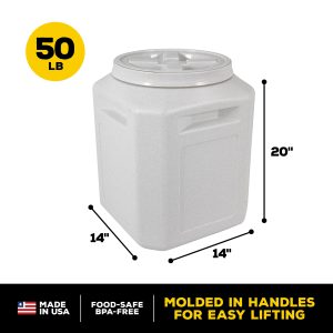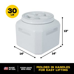 Keep your pet’s food fresh and flavorful with our sealed dog food storage container, designed to hold up to 30 or 50 pounds of pet food. Made from HDPE plastic, this durable cat and dog food storage solution is a great choice for maintaining the quality of your pet’s kibble. Its Gamma Seal Technology utilizes a threaded locking system and double gaskets, providing a controlled moisture balance while keeping pesky pests at bay. This storage container is suitable for a variety of dry foods, including birdseed and goat feed. Our pet food storage bins are engineered to last, resisting shattering and cracking. For indoor or covered outdoor use, although climate-controlled storage is recommended. Proudly made in the USA.